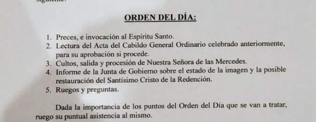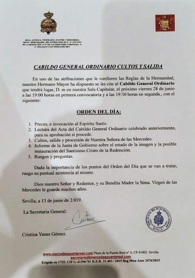 El próximo Viernes 28 de junio, a las 19:oo horas en primera citación y 19:30 horas en segunda, se celebrara en nuestra capilla, cabildo de cultos y salida, en el mismo, se informara del estado de la imagen del Santísimo Cristo de la Redención y la próxima restauración que se le va a realizar al mismo.